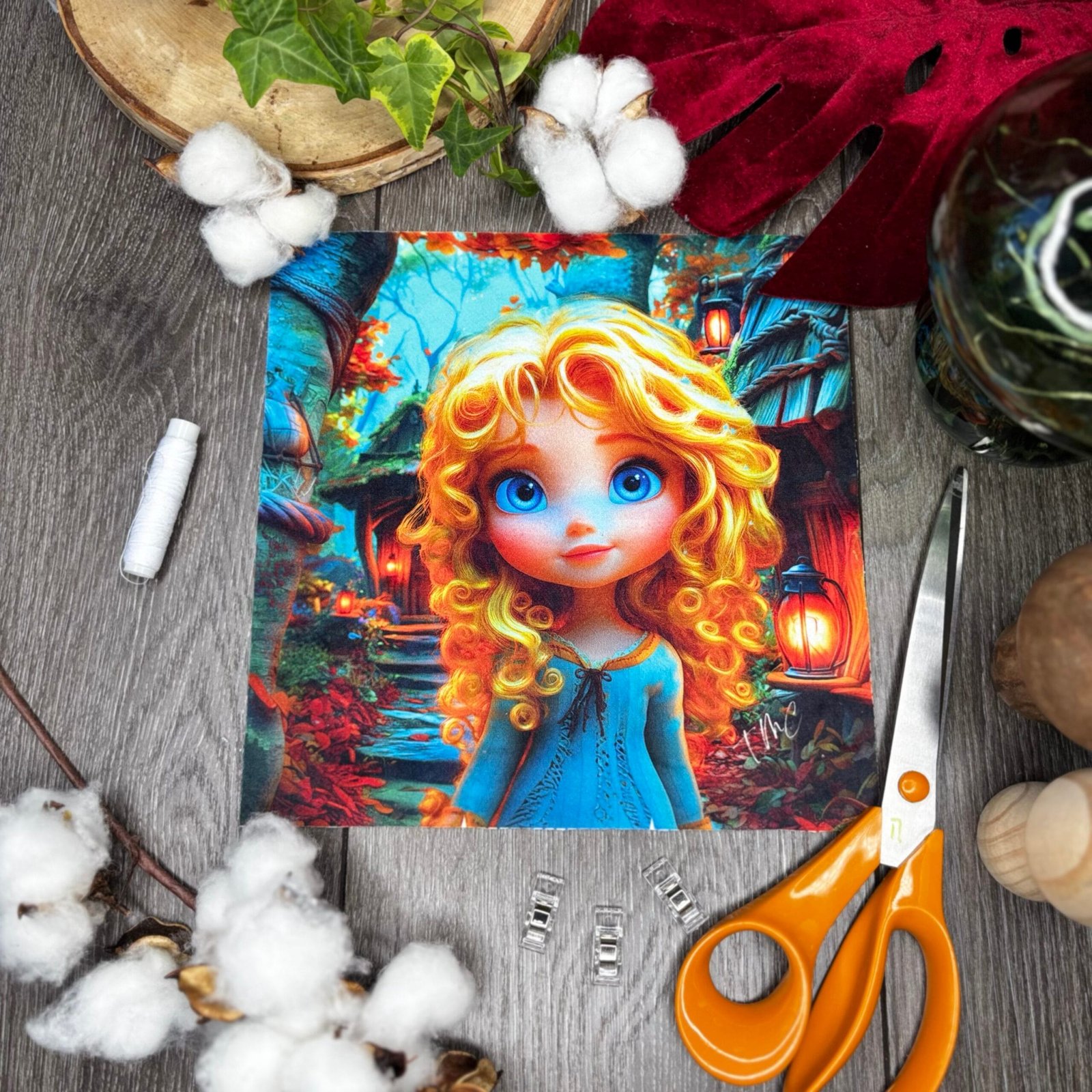 Retrouve la tendresse et la curiosité de Boucle d’Or dans ce coupon 24 × 24 cm en velours tout doux.