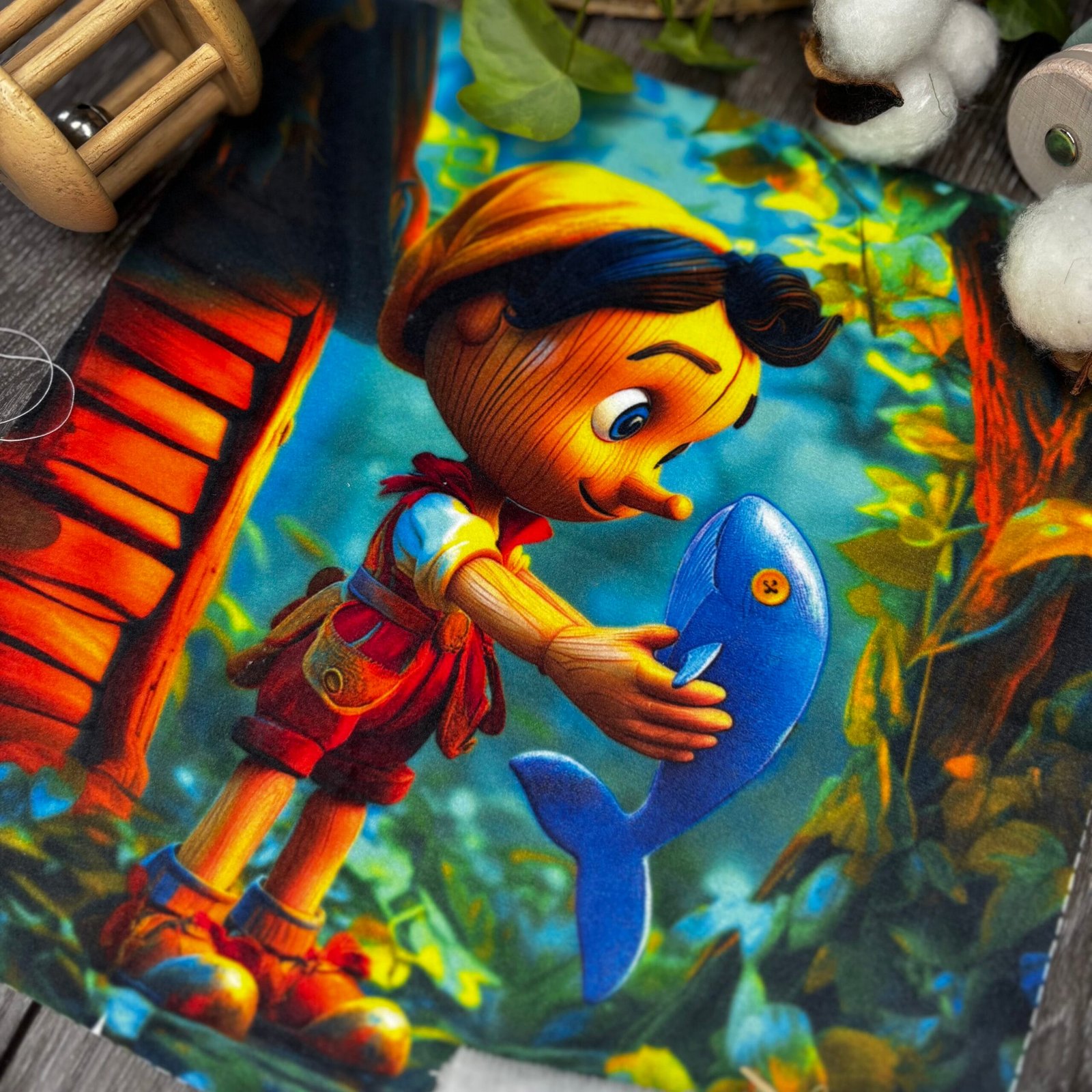 Ce panneau en tissu velours est illustré d’une adorable représentation de Pinocchio. Il est tout doux, souple et agréable à manipuler pour les petites mains.
