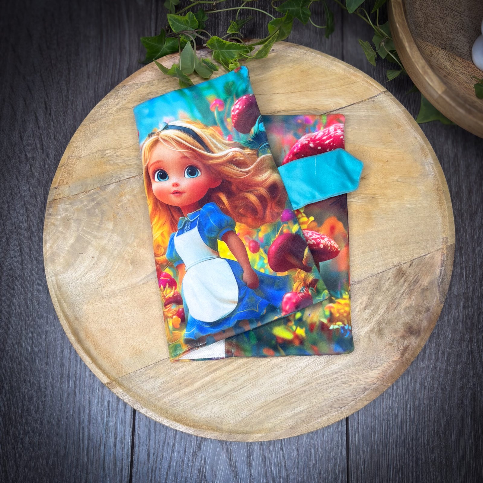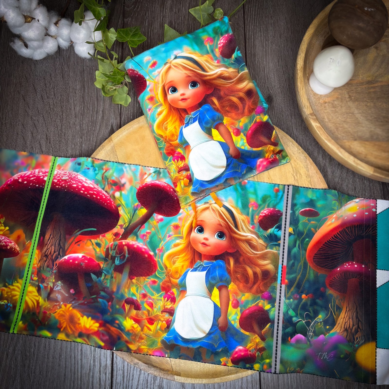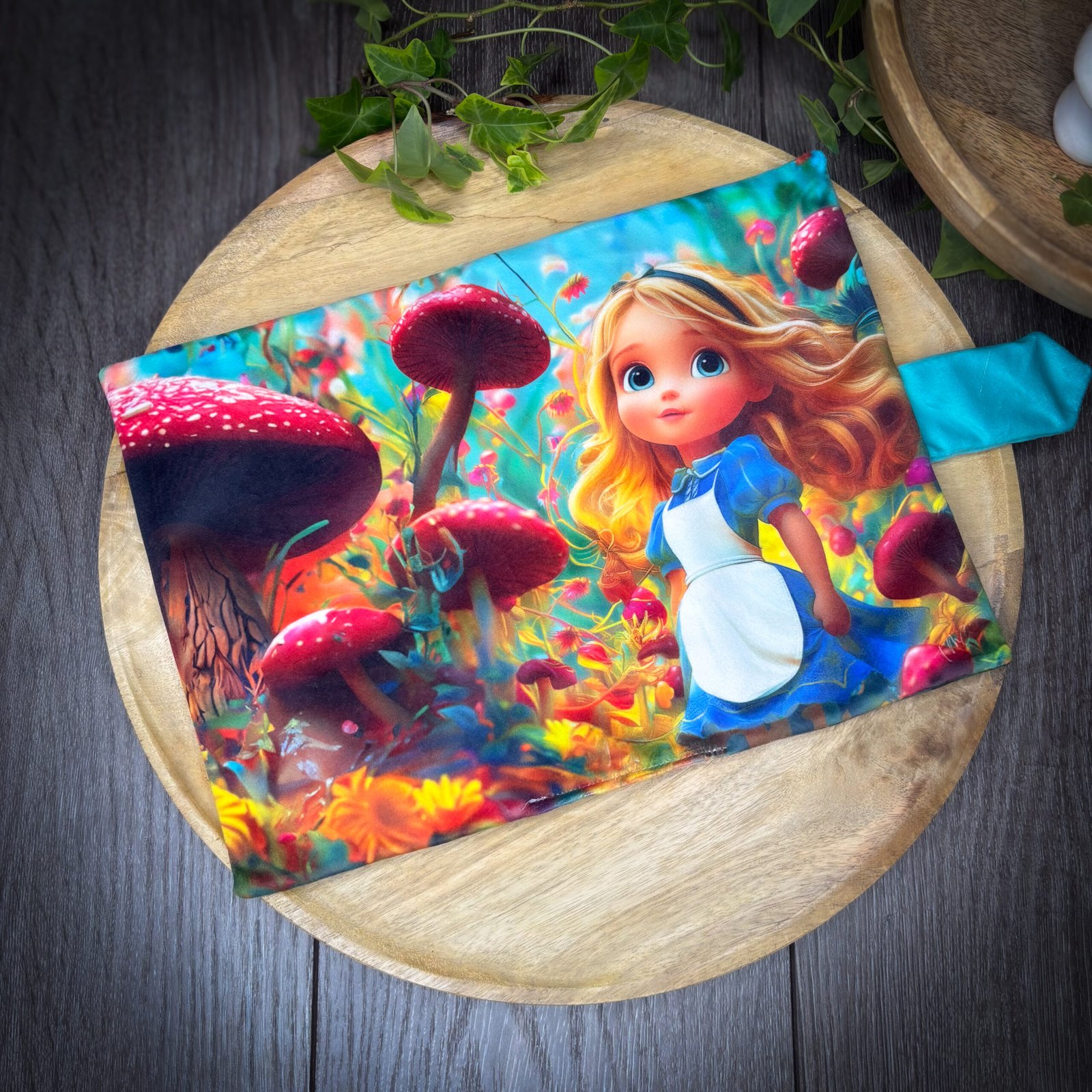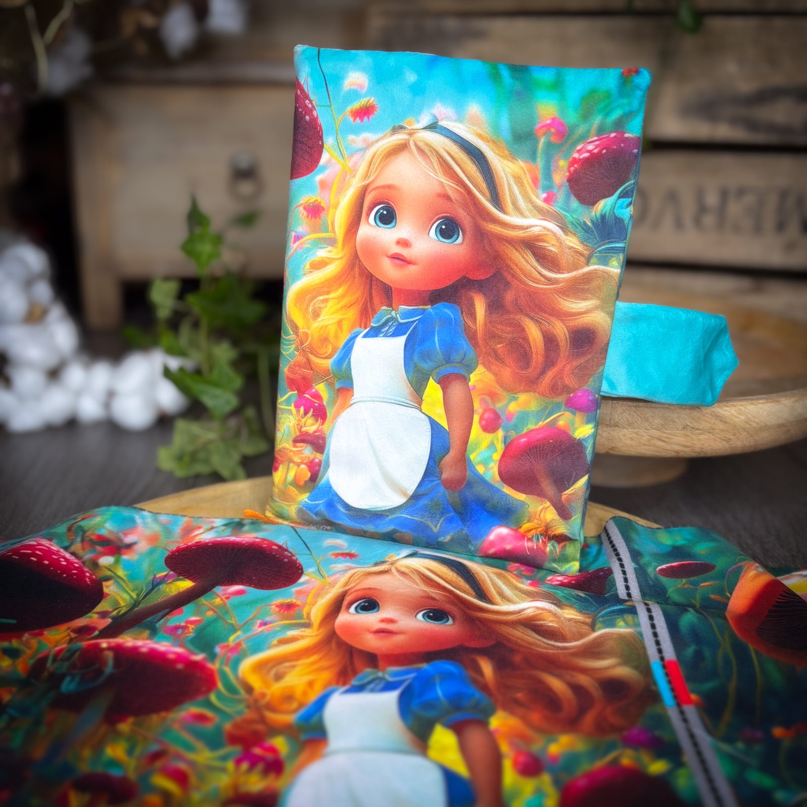 Ce panneau en velours met en scène Alice dans un univers onirique et délicat.