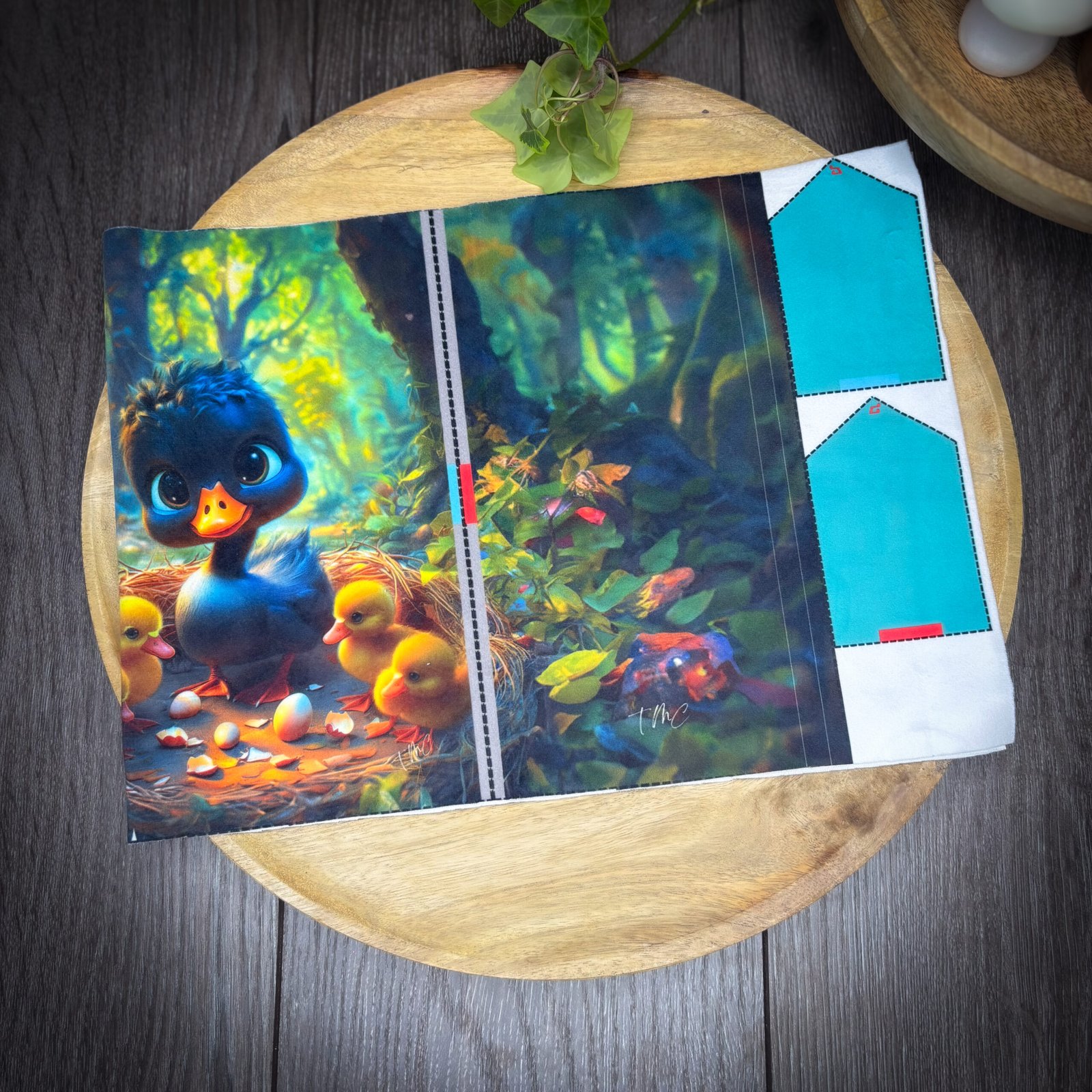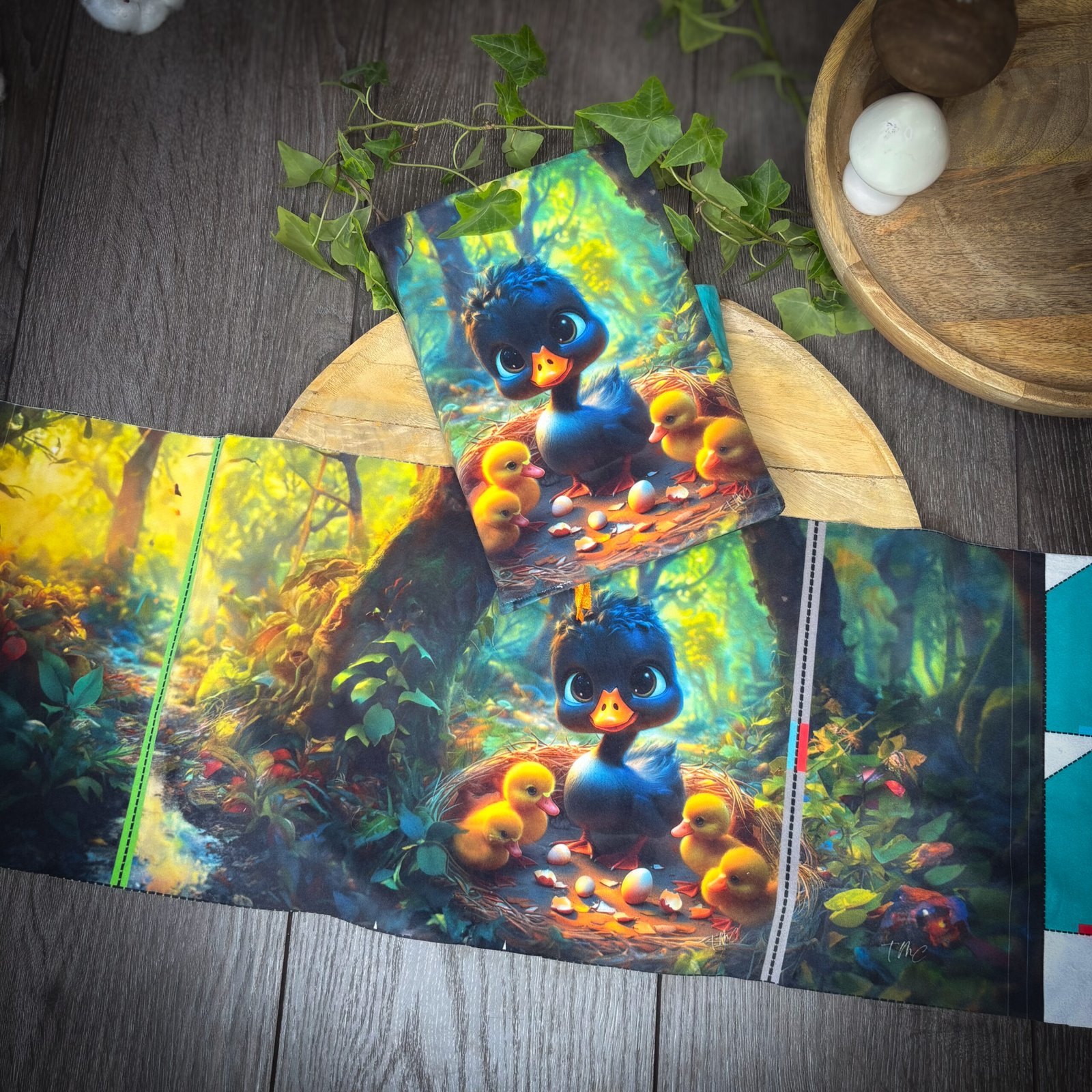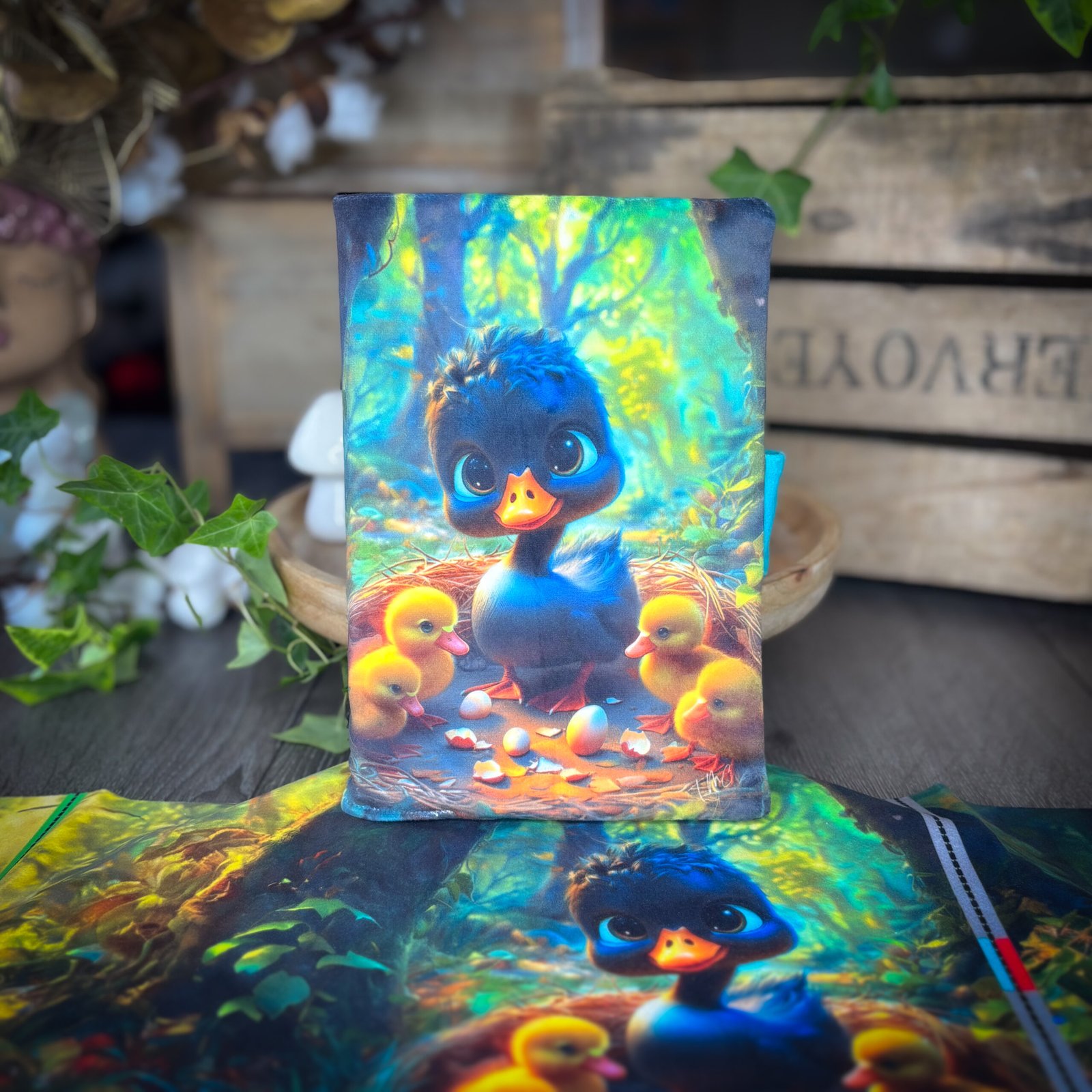 Ce panneau en velours illustre le Vilain Petit Canard dans une version tendre et apaisante. Grâce aux repères imprimés directement sur le tissu, tu réalises facilement un protège-cahier cousu main, sans stress ni patron papier.
